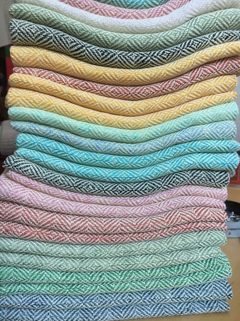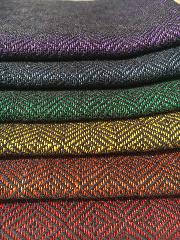 Ich liebe leuchtende Farben und probiere mich an immer neuen Kombinationen. Die Kette besteht aus Baumwolle, der Schuss aus Leinen. Die Tücher haben eine Größe von 70 x 46 cm. Beidseitig befindet sich ein Baumwollband als Aufhänger.